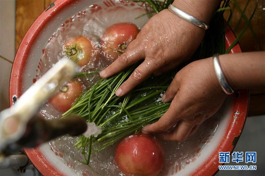 在中宁县喊叫水乡贺家口子村,村民金风花在洗菜(9月6日摄)。新华社记者 王鹏 摄