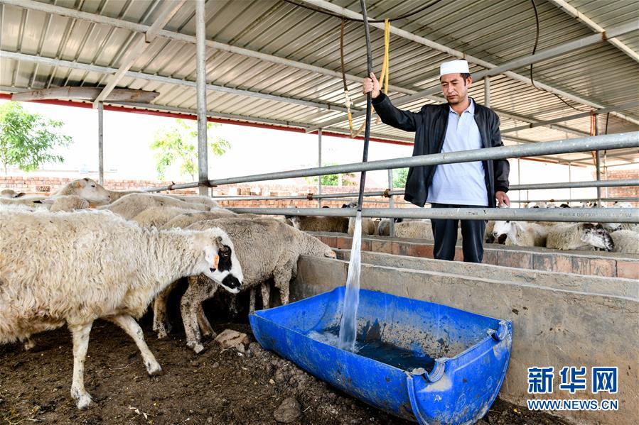 在中宁县喊叫水乡贺家口子村,养殖户贺学银在给羊喂水(9月6日摄)。新华社记者 郭绪雷 摄