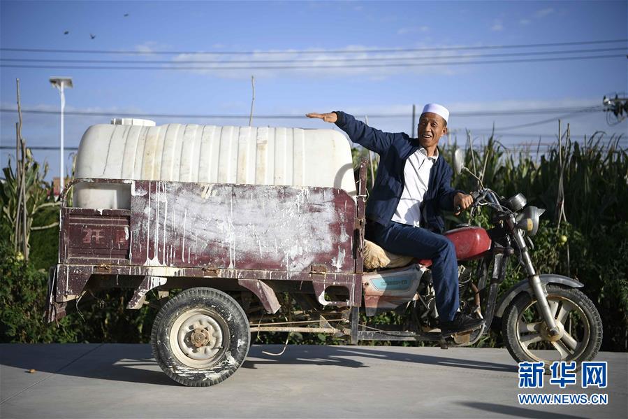 在中宁县喊叫水乡贺家口子村,村民贺金文在介绍他曾经到外地拉水时用的水桶(9月6日摄)。新华社记者 王鹏 摄