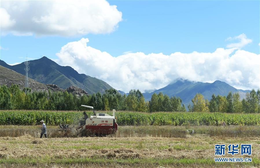 9月13日,拉萨市曲水县农民在驾驶机械收割小麦。 入秋以来,西藏拉萨各地农作物陆续成熟,农民抢抓农时收割,田间一片繁忙景象。 新华社记者 金马梦妮 摄
