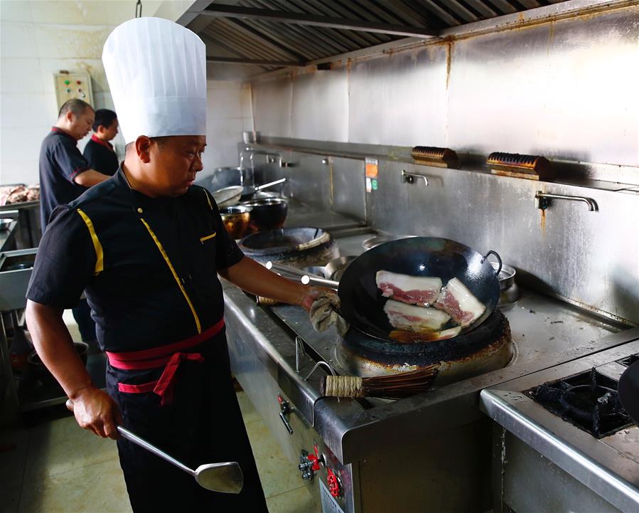 9月12日,“连山回锅肉”创始人之一代术儿在烹制“连山回锅肉”。 “连山回锅肉”是四川广汉市连山供销社餐馆代氏兄弟在原来四川回锅肉基础上改良而成,其特点是切片大如成人手掌,肥而不腻、瘦而不绵、略带辣味、鲜嫩醇香,深受食客喜爱。 新华社记者荣浩摄
