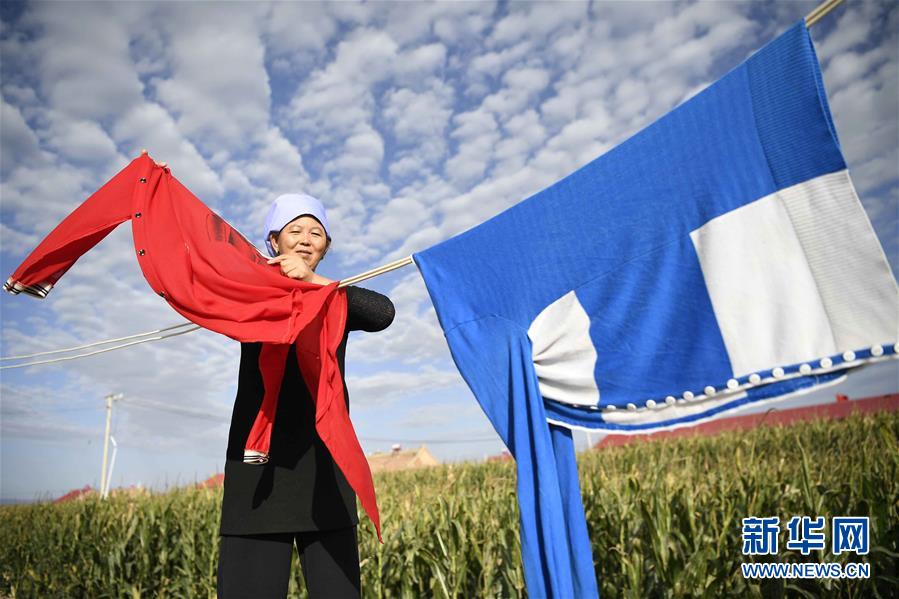 在中宁县喊叫水乡贺家口子村,村民金风花在晾晒衣服(9月6日摄)。新华社记者 王鹏 摄