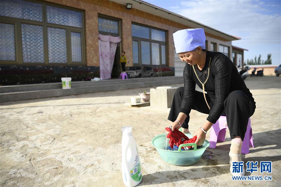 在中宁县喊叫水乡贺家口子村,村民金风花在洗衣服(9月6日摄)。新华社记者 王鹏 摄
