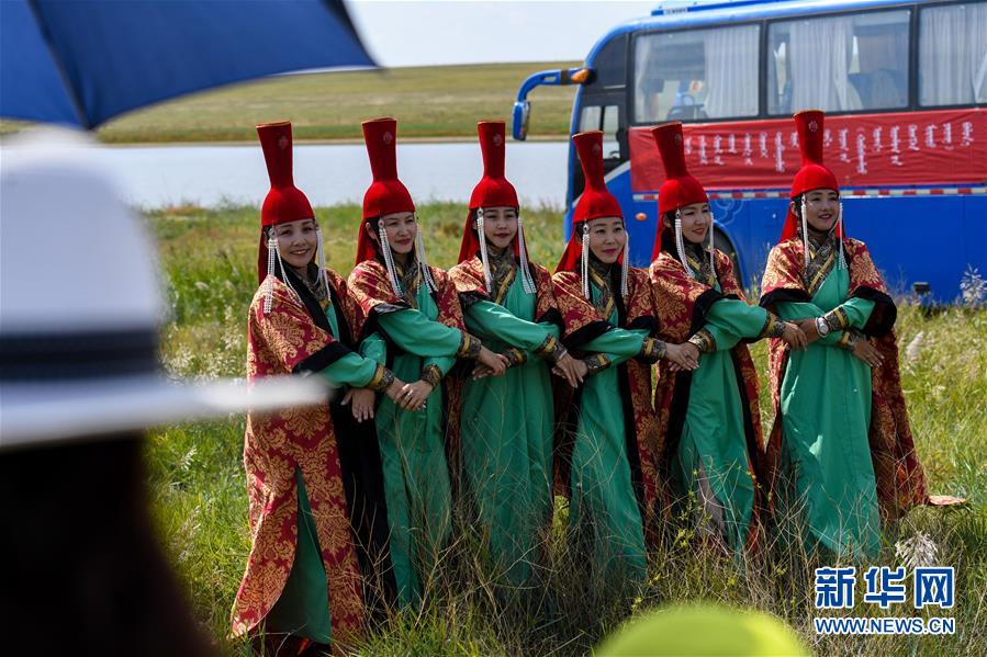9月13日,在内蒙古自治区锡林郭勒盟镶黄旗宝格达音高勒苏木浩尼钦哈夏图嘎查的一处草场,镶黄旗乌兰牧骑的队员在为牧民表演蒙古族舞蹈。 新华社记者 彭源 摄