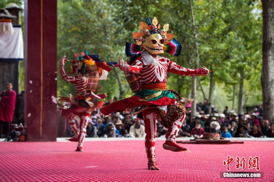 舞蹈节奏缓慢,气氛庄重神秘。跳神中间会穿插的一些诙谐幽默的哑剧小品。图为扎什伦布寺僧人佩戴面具表演跳神。中新社记者 何蓬磊 摄