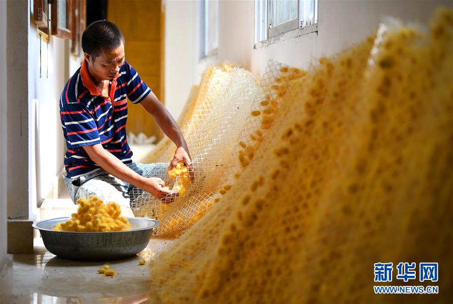 9月13日,陈东日在收获金黄色的蚕茧。 新华社发(黎寒池 摄)