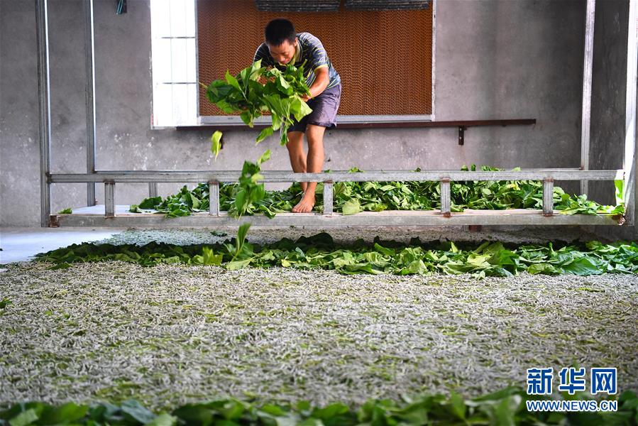 陈东日给小蚕喂食桑叶(8月21日摄)。 新华社发(黎寒池 摄)