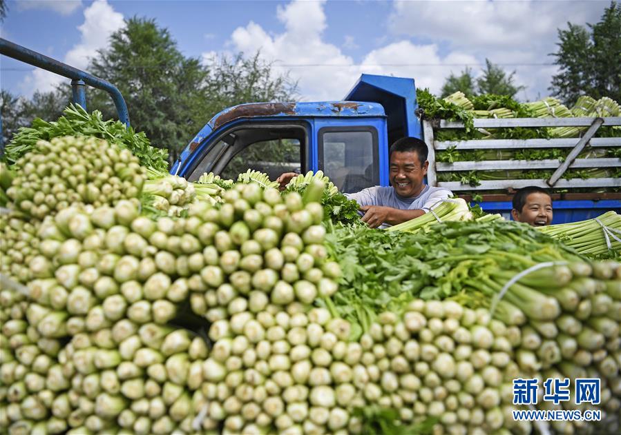 宁夏固原市西吉县将台乡火家集村,农户在搬运芹菜(8月8日摄)。新华社记者 王鹏 摄