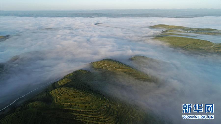云雾缭绕的宁夏彭阳县金鸡坪梯田公园(7月17日无人机拍摄)。新华社记者 王鹏 摄