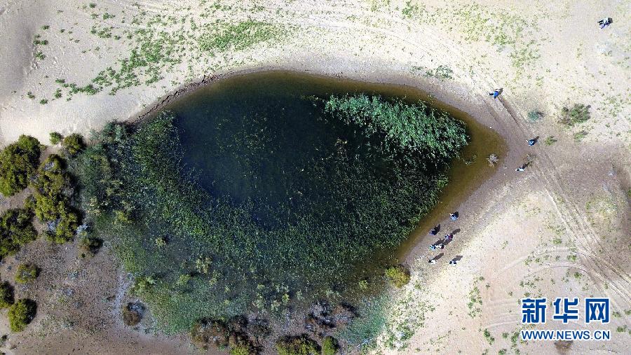 库布其沙漠水生态治理区内的一处水洼,犹如一块碧玉。新华网 发(张伟 摄)