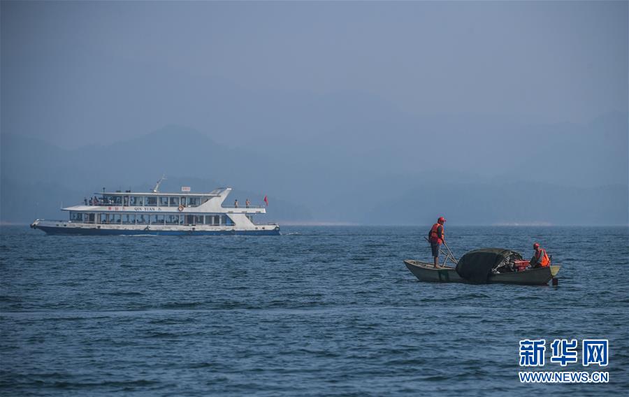 9月14日,志愿者乘坐民间公益船在湖面巡查,打捞树枝树叶等湖面漂浮物。新华社记者 徐昱摄