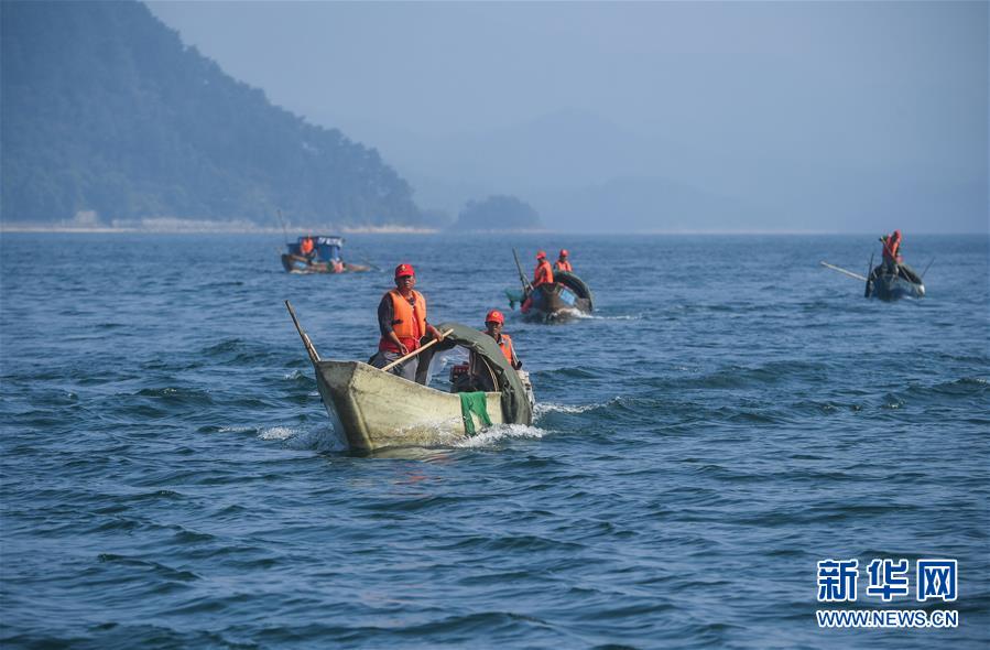 9月14日,志愿者乘坐民间公益船在湖面巡查,打捞树枝树叶等湖面漂浮物。新华社记者 徐昱摄