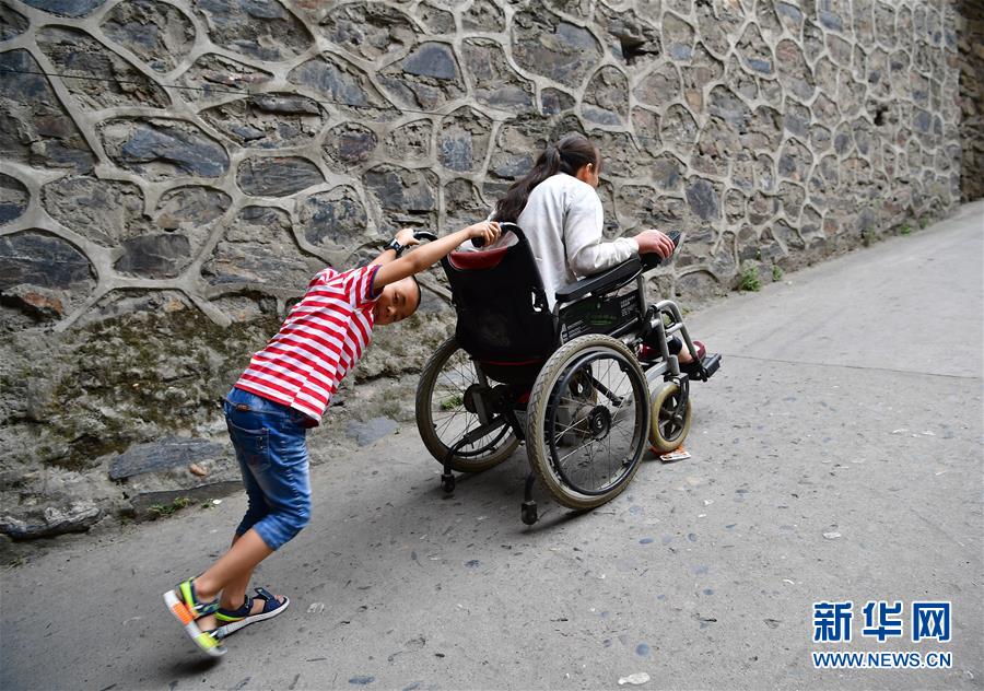 9月10日,谢君祥(左)推着妈妈的轮椅上坡。新华社记者 邵瑞摄