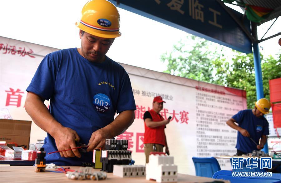 9月14日,建筑电工在凌大塘临工集散中心进行技能比拼。 新华社发(刘涛 摄)