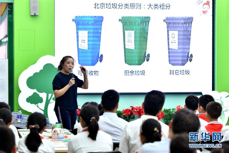9月14日,在北京白家庄小学科技园校区,中华环境保护基金会“绿色足迹”宣教团工作人员在为学生介绍环保知识。 当日,“我们在乎,源于本身——就(旧)凭(瓶)你有用环保行动”走进北京白家庄小学科技园校区,为同学们带来一堂绿色环保公开课。活动旨在通过“旧瓶变身记”,让小朋友们认识废旧饮料瓶安全回收和再利用的重要性,引导他们从小关注环境保护,助力生态环境可持续发展。 新华社记者李鑫摄