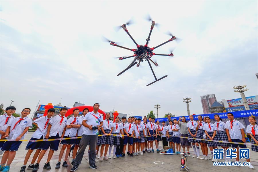 9月14日,在邯郸市邯山区明珠广场,工作人员向邯山区阳光实验小学学生演示无人机飞行技巧。 新华社记者王晓摄