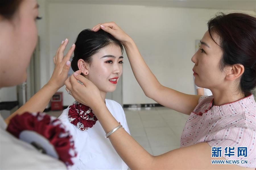 9月14日,培训人员对进港高铁乘务员讲解如何整理发型。 新华社记者 林善传 摄