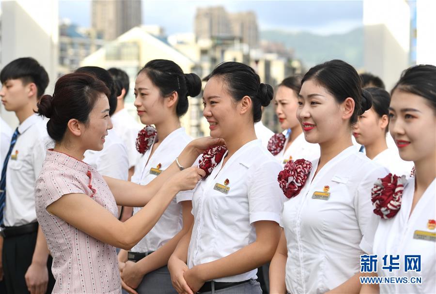 9月14日,培训人员对进港高铁乘务员进行肩花规范整理培训。 新华社记者 林善传 摄