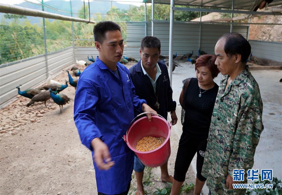 杨岐乡关上村十里种养专业合作社的刘建伟(左)在孔雀养殖基地给村里的贫困户肖华伟(右一)等讲解孔雀养殖技能(9月14日摄)。该基地现饲养近3000羽孔雀,已吸纳20余名贫困户就业。 新华社记者 宋振平摄