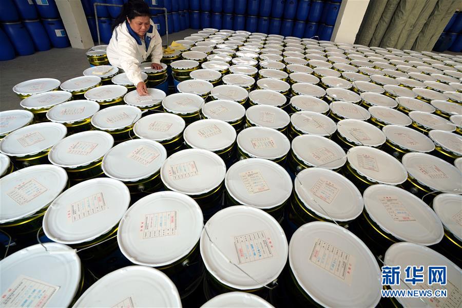 福田镇跃星村建档立卡贫困户张兰萍在萍乡市通宇特种涂料有限公司为出厂产品贴标签,她在该公司打工,年收入达2万余元(9月14日摄)。 新华社记者 宋振平摄
