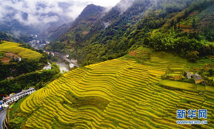 9月14日无人机拍摄的岚皋县南宫山镇桂花村一处次第成熟的稻田。 新华社记者 陶明摄