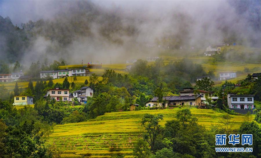 9月15日,岚皋县南宫山镇桂花村黄灿灿的稻田与漫山的云雾相映衬。 新华社记者 陶明摄