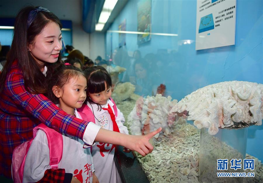 9月15日,来自陕西周至县楼观镇焦镇小学的张紫钰(右二)和来自西安曲江一小的魏嘉淇(右一)在西安曲江海洋馆内参观。 新华社记者 邵瑞 摄