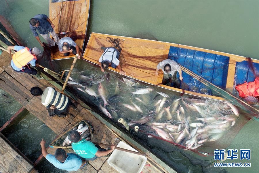 9月15日,渔民在江苏省常州市金坛区长荡湖收网起鱼(无人机拍摄)。 新华社发(陈暐 摄)