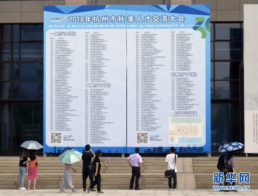 9月15日,求职者在查看2018杭州市秋季人才交流大会展位示意图。 当日,2018杭州市秋季人才交流大会在位于杭州的浙江省展览馆举行,共有250余家用人单位提供就业和实习岗位5500余个,吸引众多求职者前来应聘。 新华社发(施健学 摄)