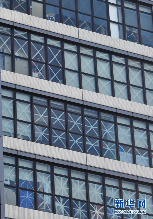 9月15日,一栋建筑的窗户上贴满胶纸,以防台风破坏。 香港天文台预计,超强台风“山竹”将于本周日最接近香港。香港市民已做好全面防御台风的准备。 新华社记者吕小炜摄