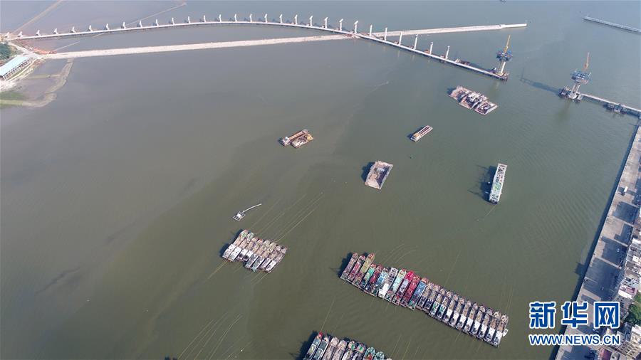 9月15日无人机拍摄的广东茂名博贺渔港回港避风的船只。新华社记者 张加扬 摄