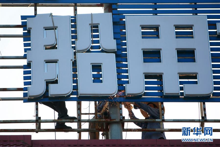 9月15日,在广东茂名博贺渔港,工人拆除广告牌,防御台风“山竹”。 新华社记者 张加扬 摄