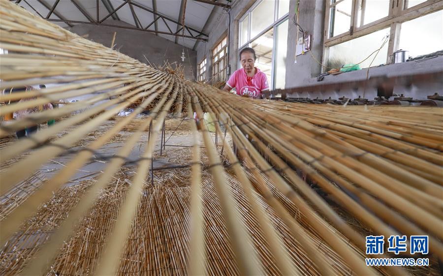 9月15日,河北省玉田县杨家板桥镇老蒲庄村的芦苇编织手艺人在车间编织苇帘。 眼下,河北省唐山市玉田县杨家板桥镇的各家芦苇编织作坊一片忙碌,传统手艺人抓紧编织苇帘,完成来自国内外的订单,供应市场。 新华社发(刘满仓 摄)