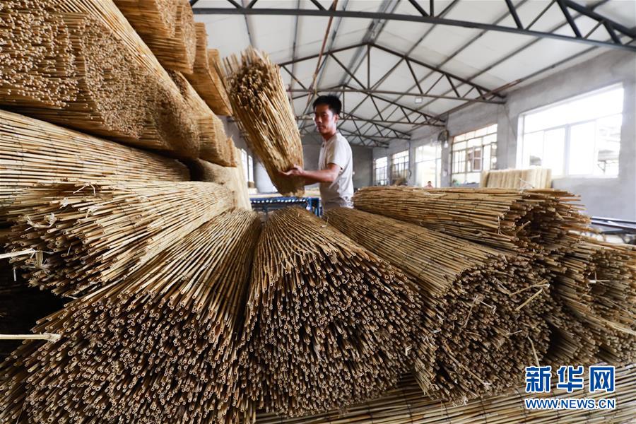 9月15日,河北省玉田县杨家板桥镇老蒲庄村的芦苇编织手艺人在车间码放成品。 眼下,河北省唐山市玉田县杨家板桥镇的各家芦苇编织作坊一片忙碌,传统手艺人抓紧编织苇帘,完成来自国内外的订单,供应市场。 新华社发(刘满仓 摄)