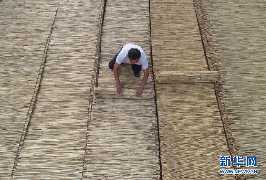 9月15日,河北省玉田县杨家板桥镇老蒲庄村的芦苇编织手艺人在铺放成品苇帘。 眼下,河北省唐山市玉田县杨家板桥镇的各家芦苇编织作坊一片忙碌,传统手艺人抓紧编织苇帘,完成来自国内外的订单,供应市场。 新华社发(刘满仓 摄)