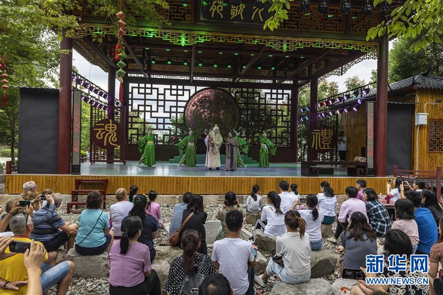 9月16日,游客在秭归县屈原故里景区观赏大型历史舞台剧《礼魂》。 当日,由湖北省秭归县创作的大型历史舞台剧《礼魂》在屈原故里景区内公演,古色古香的舞台,绿树成荫的露天剧场,给观众带来不一样的视听感受。 打造独具特色的文艺剧目,丰富基层文化产品供给是近年来秭归县着力挖掘屈原文化、峡江文化、端午文化,促进文化旅游产业融合发展的一个缩影。近年来,秭归县创作了民俗歌舞剧《大端午》、历史舞台剧《礼魂》、戏曲《县太爷断案》和非遗传承人表演的《民间记忆》等系列文艺精品剧目,让众多居民和游客近距离感受传统文化的魅力。 新华社发(郑家裕 摄)