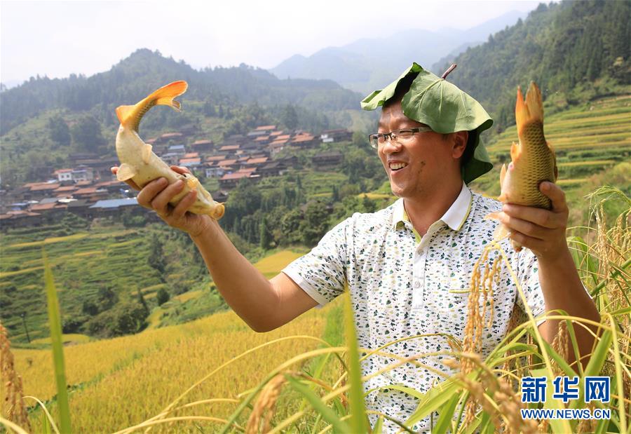 9月15日,在广西融水苗族自治县杆洞乡花孖苗寨,游客展示参加捉鱼比赛捉到的稻田鱼。 9月15日,广西柳州市融水苗族自治县杆洞乡花孖苗寨举行2018金秋烧鱼季活动,村民和游客共同开展水田拔河比赛、田间捉鱼比赛和烧鱼等活动庆丰收。 新华社发(龙涛 摄)