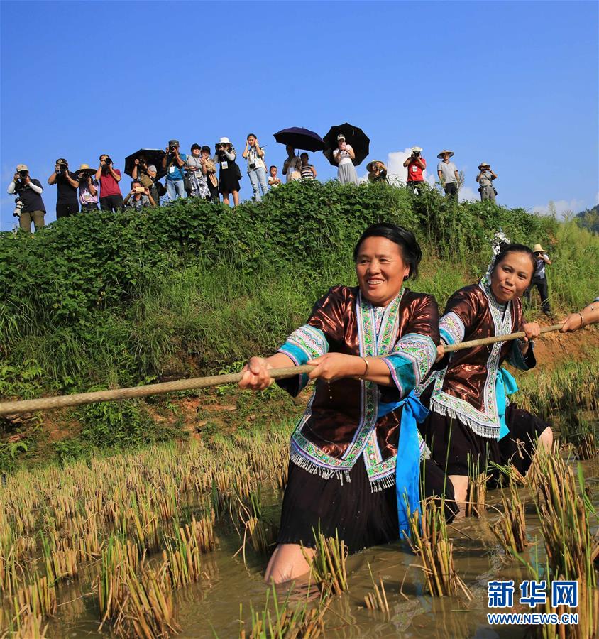 9月15日,在广西融水苗族自治县杆洞乡花孖苗寨,人们在参加水田拔河比赛。 9月15日,广西柳州市融水苗族自治县杆洞乡花孖苗寨举行2018金秋烧鱼季活动,村民和游客共同开展水田拔河比赛、田间捉鱼比赛和烧鱼等活动庆丰收。 新华社发(龙涛 摄)