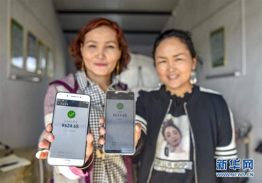 合作社工作人员沙吾丽(左)通过微信向员工转账驼奶的销售收入(9月14日摄)。 新华社记者 赵戈 摄