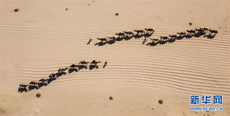 游客骑着骆驼在宁夏石嘴山市平罗县沙湖景区观光旅游(9月12日无人机拍摄)。 宁夏,地处中国西北腹地。这里的大山、大河、草原、沙漠、湖泊,犹如一幅幅美妙画卷,让人流连忘返。 新华社记者 王建华 摄