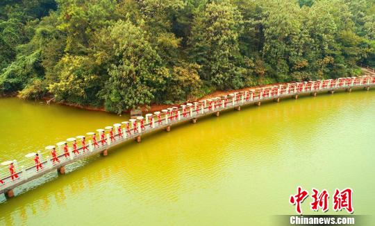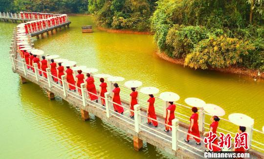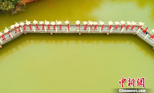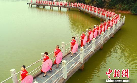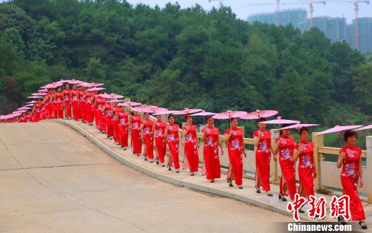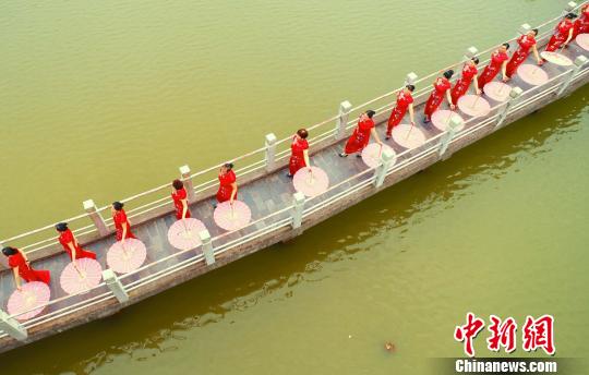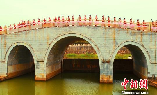 泰和县老年体协旗袍协会100多位旗袍佳丽站在拱桥上表演。 邓和平 摄