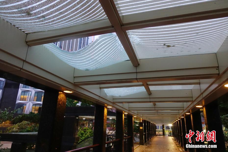 9月16日,强台风“山竹”袭击香港,位于湾仔的一个人行天桥的顶部玻璃被强风击碎,好在有胶带保护,没有坠落地面。 中新社记者 张炜 摄
