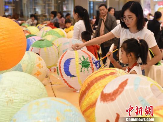 图为小朋友用颜料绘制灯笼喜迎中秋佳节。 周毅 摄