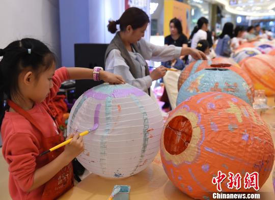 图为小朋友与家长绘制灯笼迎中秋。 周毅 摄
