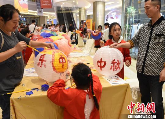 图为小朋友与家长一起共同绘制中秋灯笼。 周毅 摄
