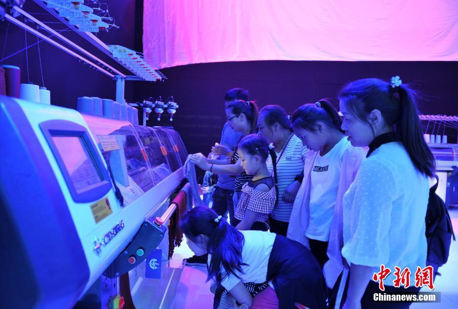 9月16日,众多市民正在体验智能穿戴。日前,第三届白洋淀国际服装文化节在河北雄安新区容城县开幕。其中时尚科技展以智能穿戴、3D体感试衣系统等以互动体验为主,通过功能性新型面料、创新设计、智能制造等新技术,展示服装行业科技创新的成果。图为市民参观智能针织机。 中新社记者 韩冰 摄