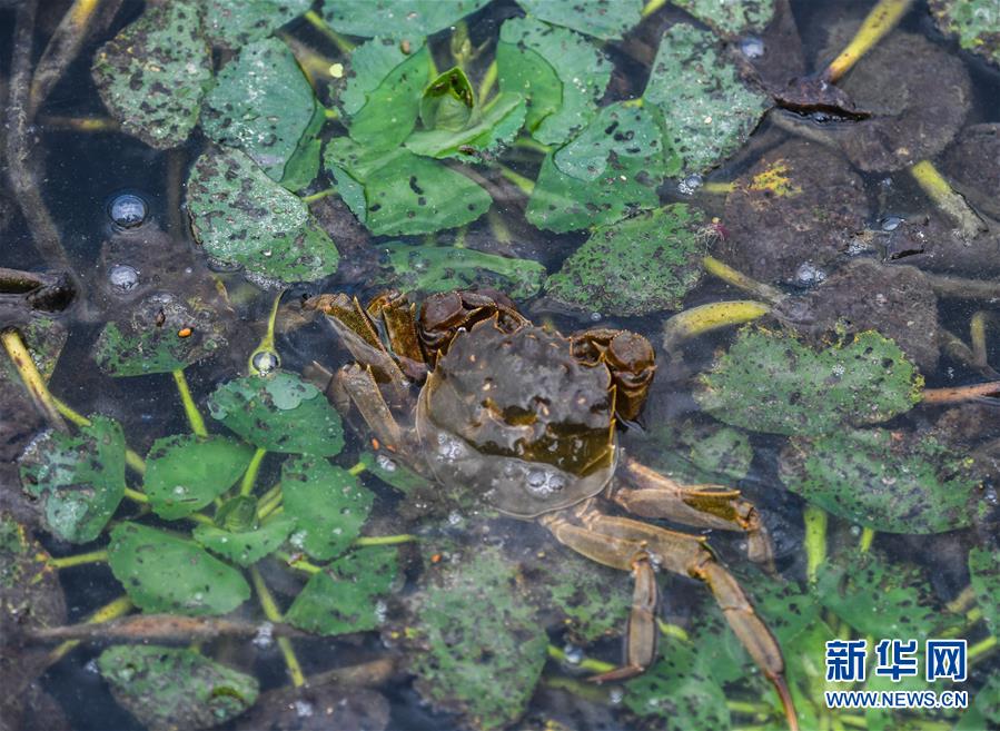 9月16日,一只太湖蟹在太湖生态养殖区内。新华社记者徐昱摄