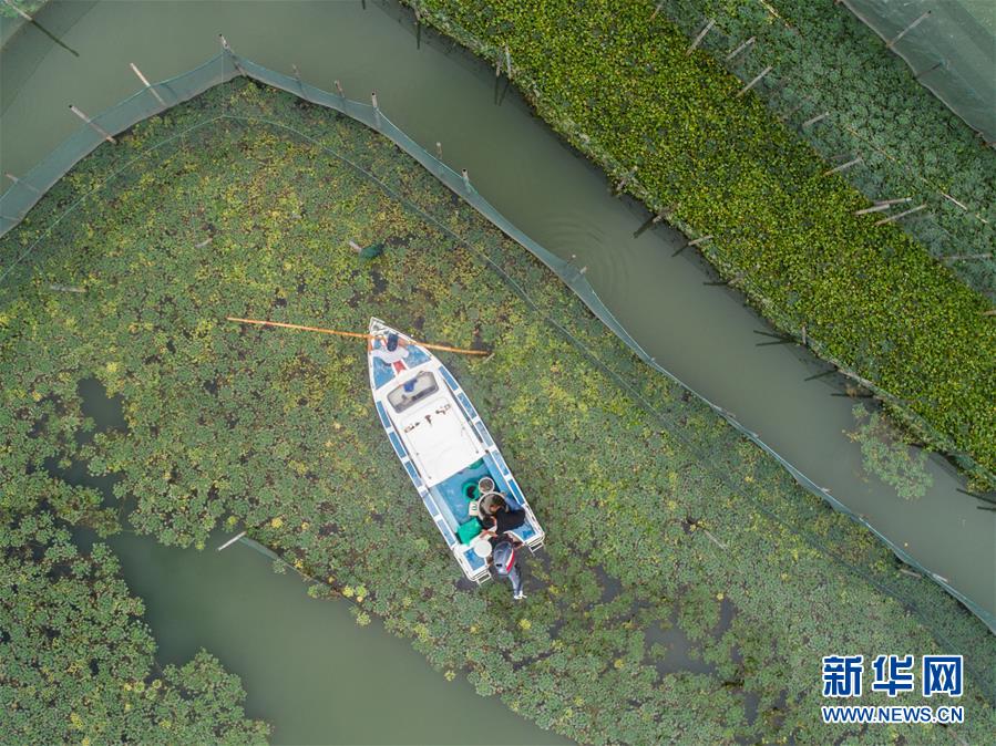 9月16日,浙江省湖州市织里镇乔溇村金福蟹业养殖基地的养殖户乘船在太湖里的养殖场内收获太湖蟹(无人机拍摄)。新华社记者徐昱摄