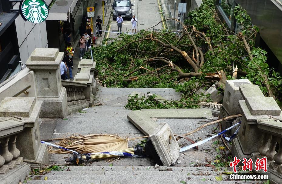 受强台风“山竹”吹袭,拥有百年历史的香港法定古迹都爹利街煤气灯和台阶严重受损,四座全香港仅有的煤气灯中三座被倒塌的大树损毁,仅剩西南角一座煤气灯未受波及,台阶两旁的部分栏杆也受损。都爹利街煤气灯于1979年被列为香港法定古迹,很多影视剧和音乐影片在这里拍摄外景,也是游客“打卡”的著名景点。图为一座煤气灯倒塌在台阶上。 中新社记者 张炜 摄