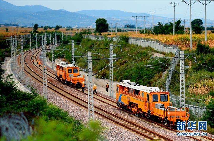 9月17日,捣固车在瓦日铁路壶关至平顺区段一曲线处进行线路捣固施工。 新华社记者李安摄